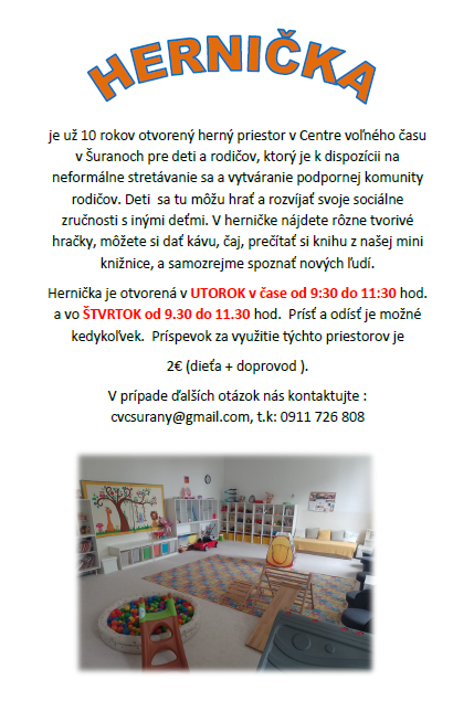 V priestoroch CVČ ďalej funguje otvorená hernička, ktorá 2-krát v týždni slúži na stretnutia